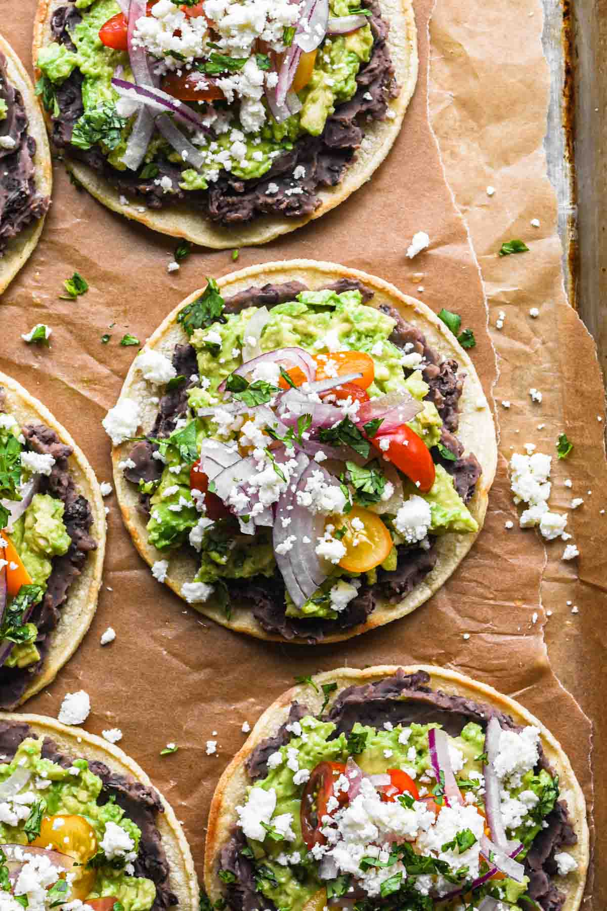 The core ingredients of these vegetarian black bean and avocado tostadas are truly black beans and avocados. Beyond that, the toppings can be interchangeable with any of your favorites.