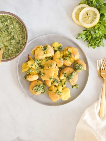 Smashed Lemony Potatoes with Chimichurri Sauce