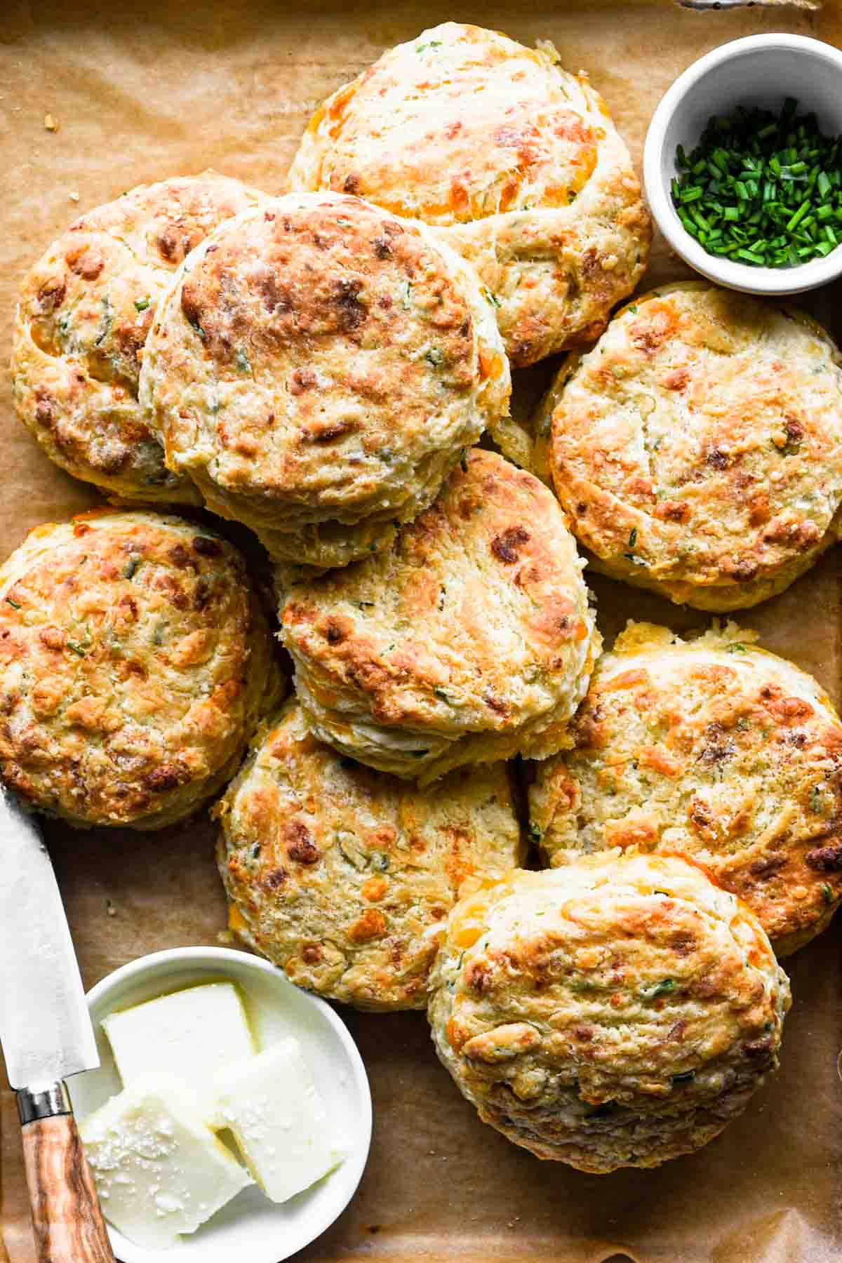 These Cheddar Chive Biscuits are incredibly fluffy and tender with flaky layers, and are loaded with cheddar cheese and fresh chives. They're baked until golden brown and best when slathered with butter!