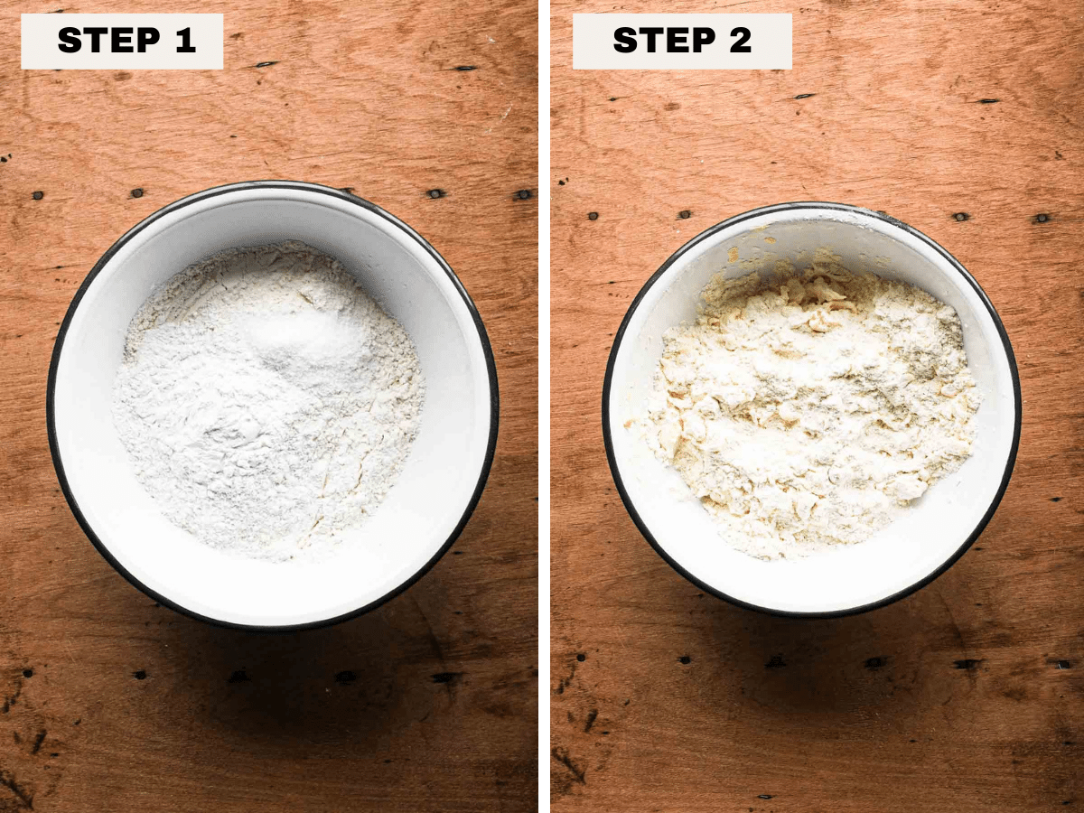 1. Make the dry mixture. In a large bowl mix together the flour, baking powder, and salt.