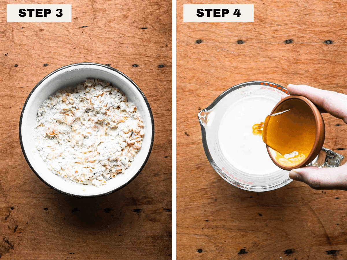 - In a measuring cup or small bowl, mix together the honey and buttermilk. The honey may clump up a little but but mix it into the buttermilk best you can (I found this pretty easy when using a fork).