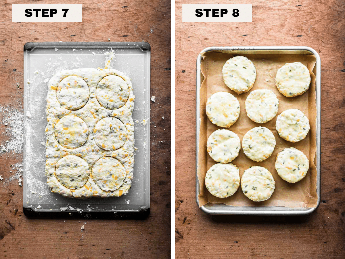8. Bake. Transfer the biscuits to a parchment-lined baking sheet about ¼ inch apart. Brush the tops of the biscuits with melted butter and bake at 425℉ for 20-25 minutes until golden.