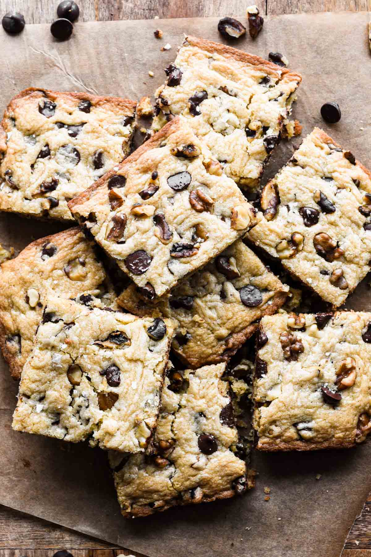 These Chocolate Chip Walnut Blondies are everything you'd want from a blondie. They're perfectly golden, chewy and gooey beyond belief with a slightly crisp exterior, and loaded with melty chocolate chips and crunchy walnuts.