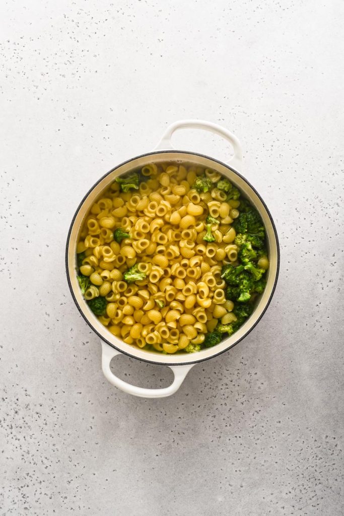 - Step 1: Cook the pasta and broccoli. In a large pot, bring salted water to a boil. Add dry pasta and cook for 4 minutes, then add the chopped broccoli in as well. Cook for another 4 minutes and drain, then set aside.