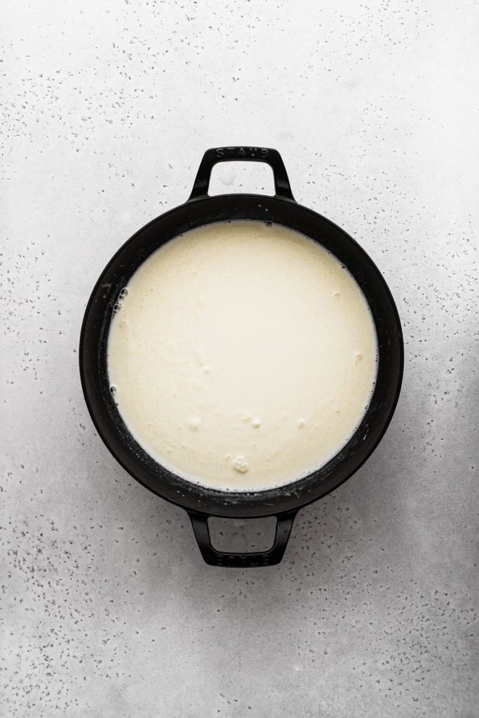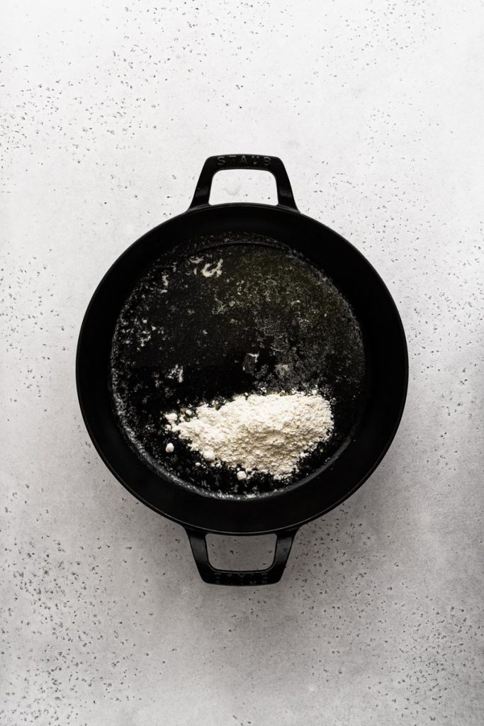 - In your heavy-bottomed pot, melt the butter over medium heat. Once the butter is melted, add in the flour and cook for 2 minutes until all the dry flour is absorbed and the mixture is a light golden color (your roux).