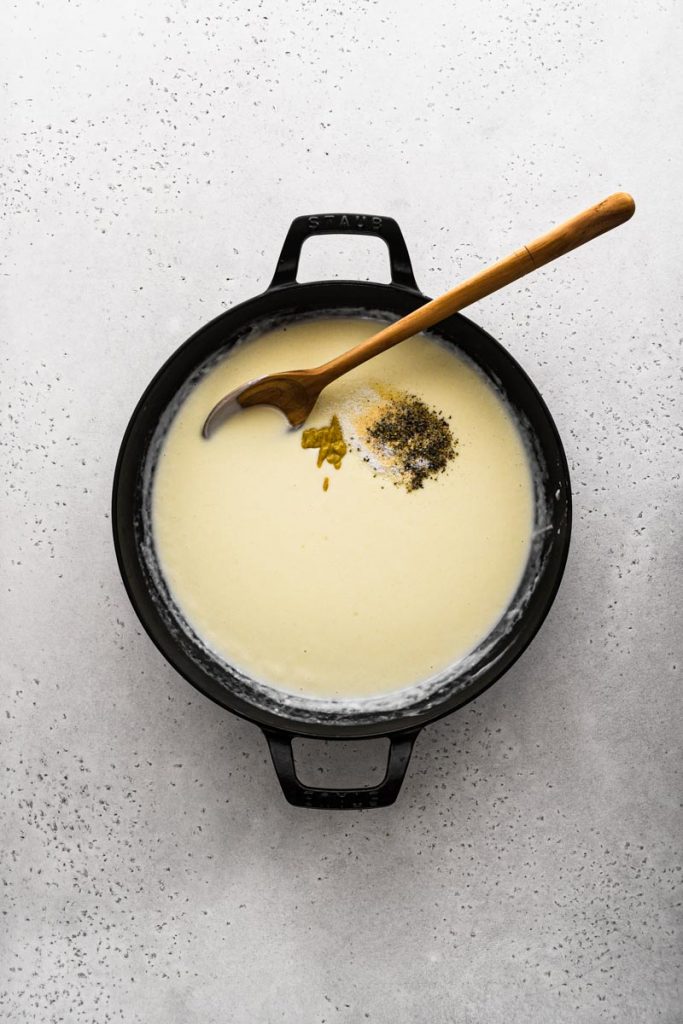 - Step 4: Add the spices and mustard. Turn your heat down to low and whisk I the salt, pepper, onion powder, and dijon mustard.