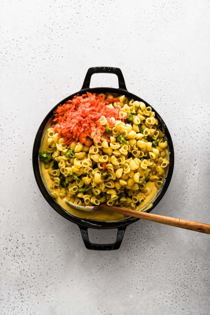 - Step 6: Combine it all. Add your pasta, broccoli, and grated carrots to the cheese mixture and mix together until all the pasta/broccoli/carrots are coated in creamy cheese.
