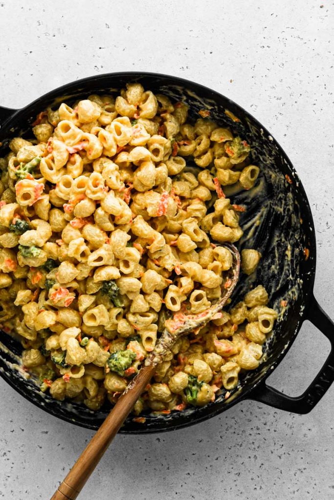 - Add your pasta, broccoli, and grated carrots to the cheese mixture and mix together until all the pasta/broccoli/carrots are coated in creamy cheese.