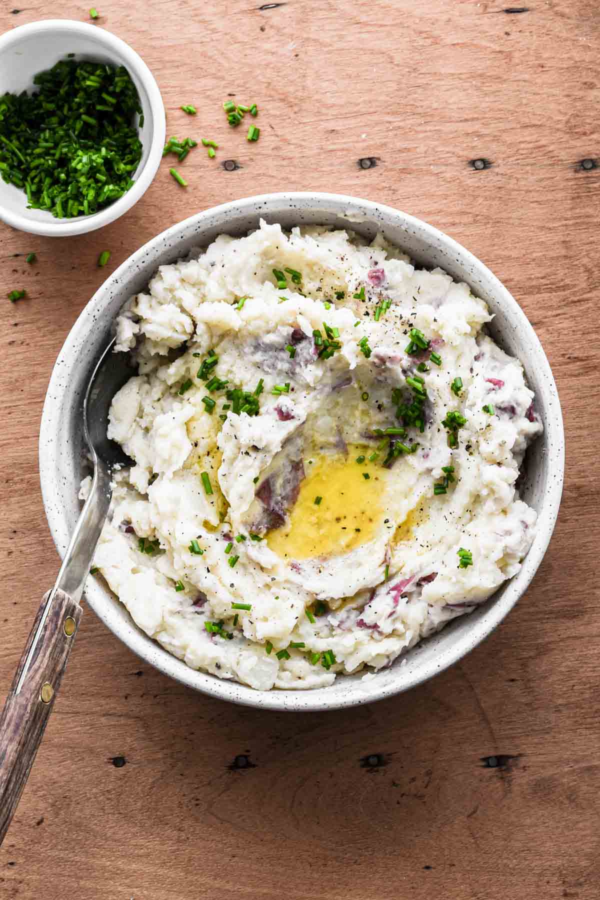 - Red skin potatoes: I love using redskin potatoes in mashed potatoes because their skin is more tender which means you can leave it on (and skip the hassle of peeling!) and they have a lower starch content than other potato varieties, which means they have a great texture that's smooth and a little chunky at the same time.