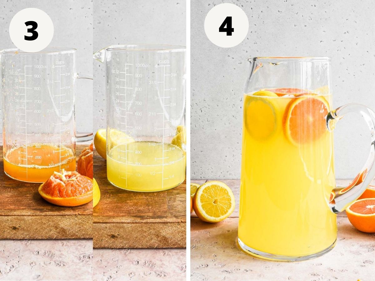 - Combine lemon juice, orange juice, water, and cooled simple syrup. Stir to combine.