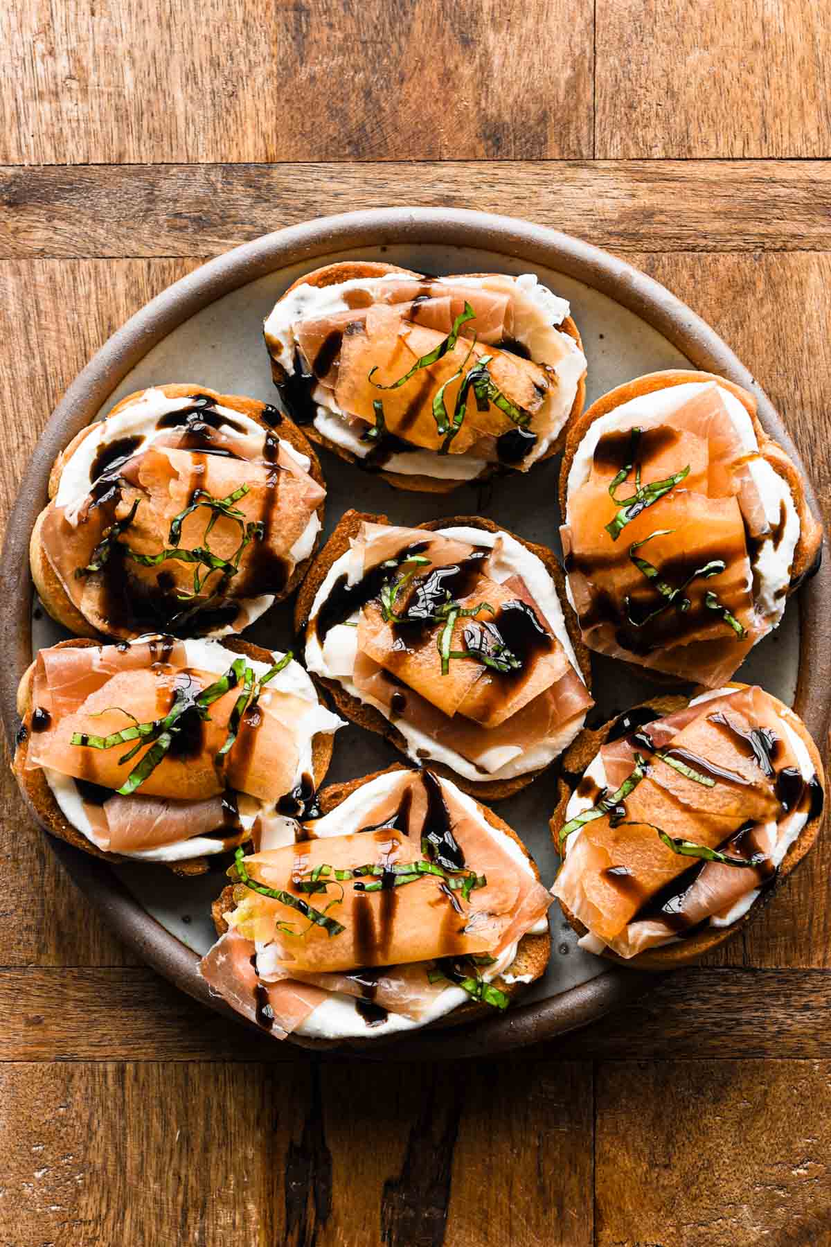 - Step 2: Assemble the crostini. Onto each slice of bread, first layer a spoonful of whipped ricotta, then a folded slice of prosciutto, then a folded slice of cantaloupe. Finish with a light drizzle of balsamic reduction and a sprinkling of fresh basil.