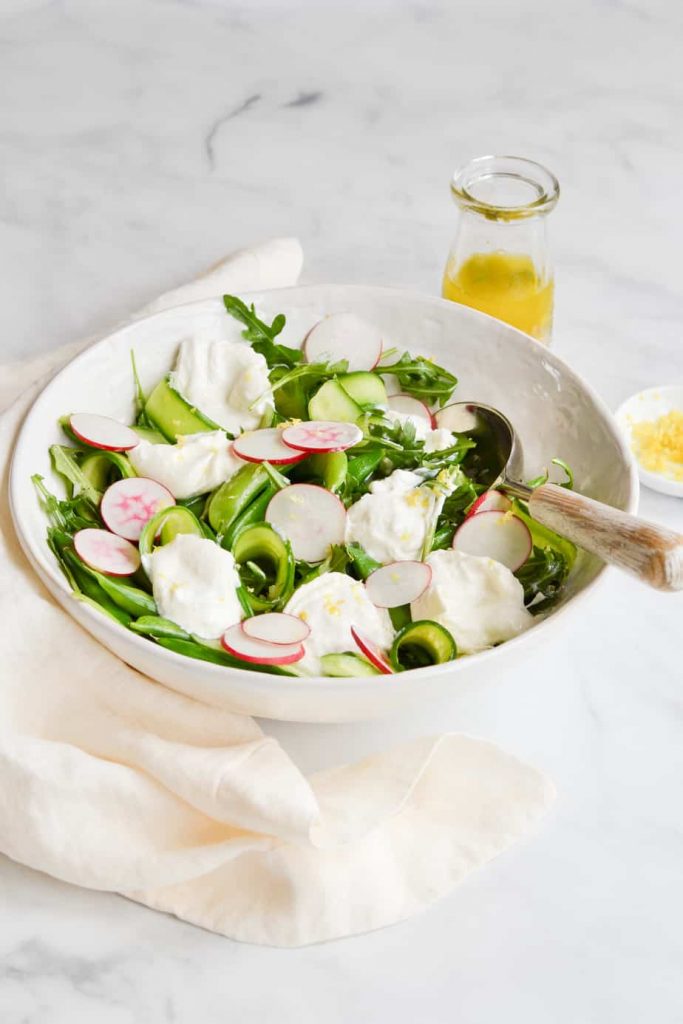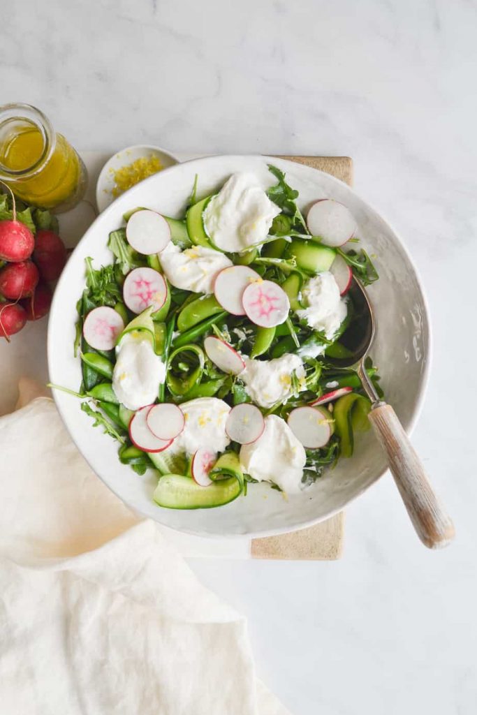 It's filled with all the best ingredients that spring has to offer. Snap peas, cucumbers, radishes, and the best part - creamy burrata cheese. Am I the only one that wants to practically swim in burrata cheese? Or use it as my pillow? It's just so lush. Someone please tell me I'm not alone there!
