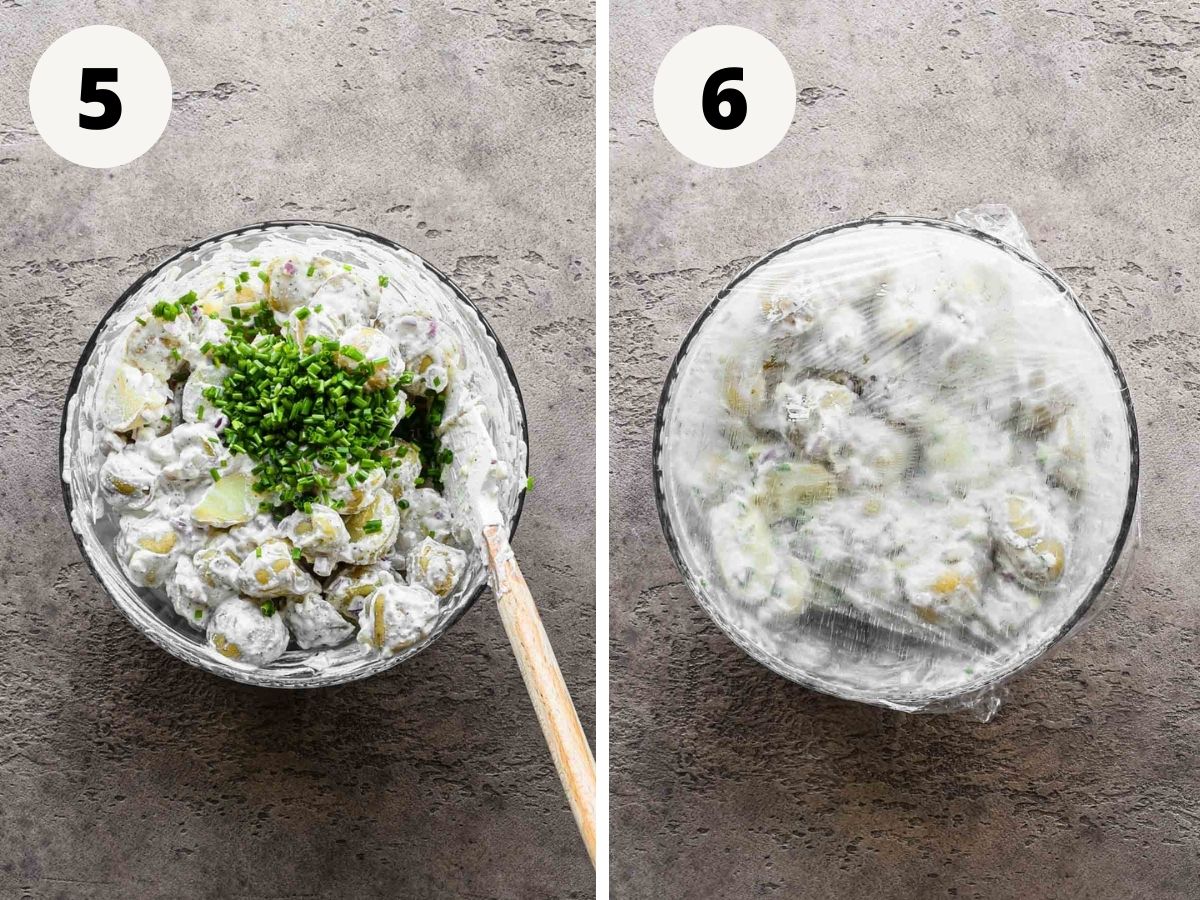 - Add ⅓ cup fresh chives to the potatoes and gently mix to combine.