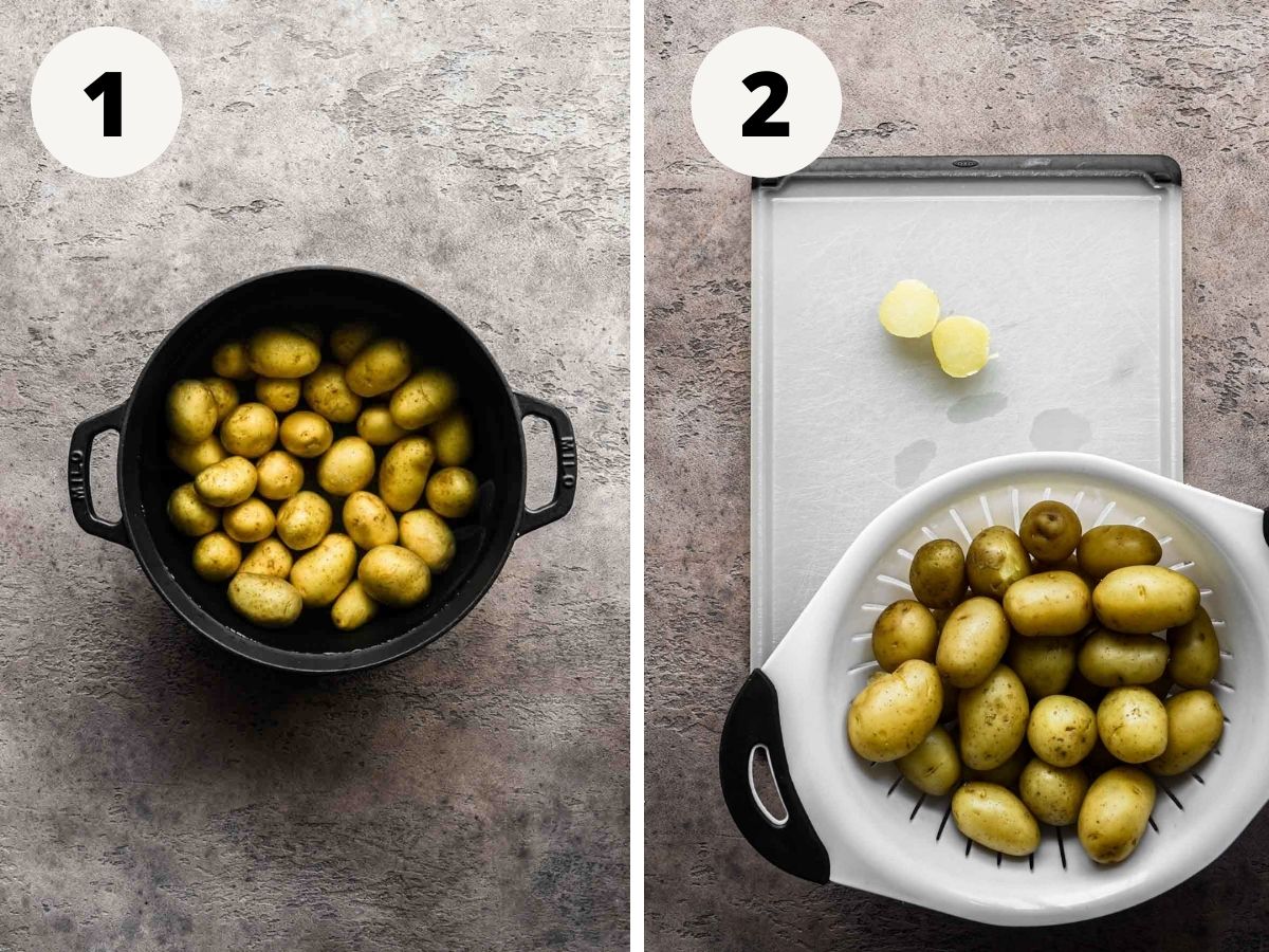 - Put the potatoes in a large pot and fill with cold water to cover them plus 1 inch. Add 2x 5-finger pinches of kosher salt and bring to a boil. Once boiling, cook for 15-18 minutes until the potatoes are fork-tender. Drain and set aside to cool for 10 minutes.