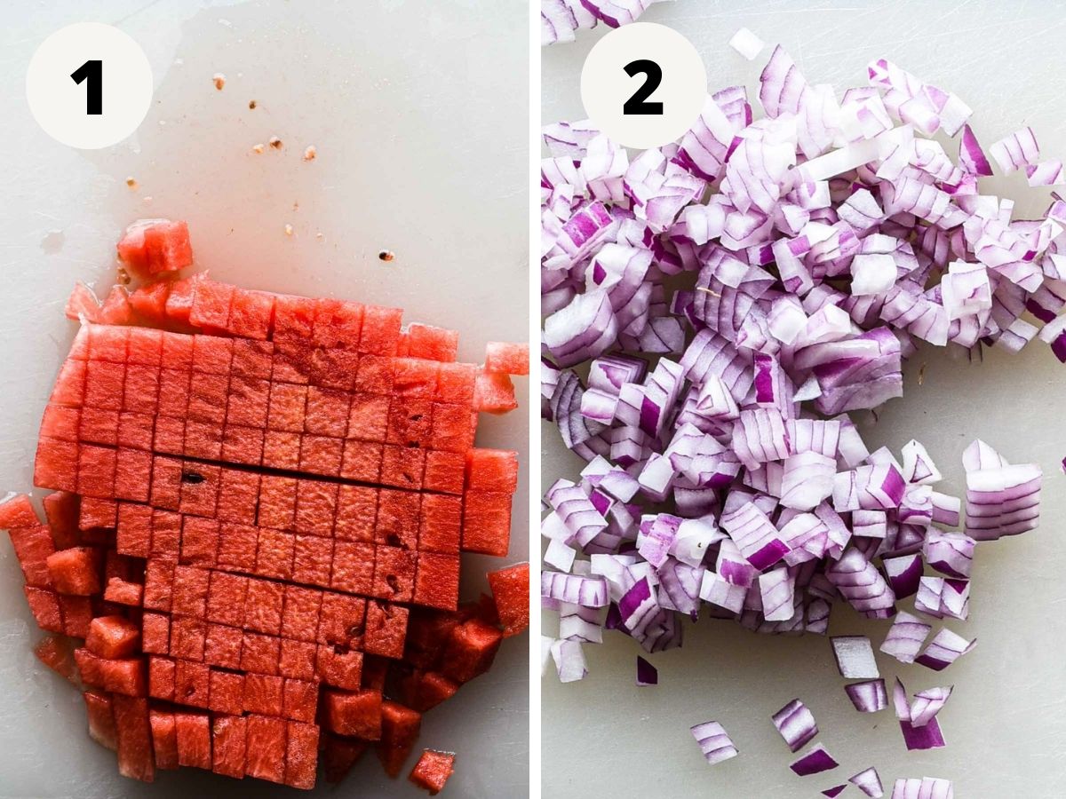 2. Dice red onion. Finely dice the red onion.