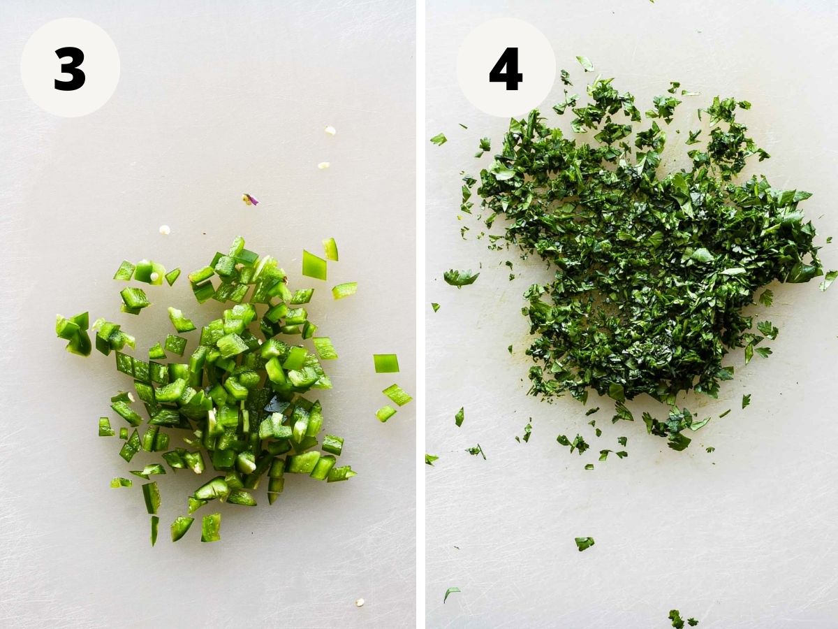 3. Dice jalapeño. Cut in half and remove the seeds and membrane then dice into small pieces.